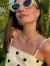 שרשרת קולר עשויה חרוזי אקריל בצורת טיפה בגוון ירקרק מחרפן בשילוב פניני מים מתוקים אובליות ובמרכזה אלמנטים מוזהבים מיוחדים בעלי שיבוץ זרקונים שנותנים לשרשרת מראה יוקרתי