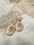 עגיל תלוי עשוי פליז מצופה זהב בעל מראה מסולסל וייחודי, תליון אובלי עשוי צדף במראה פנינה עליו פרח. עגיל בעל מראה וינטג', עדין וקלאסי