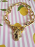 צמיד חוליות אובליות גסות עשוי פליז מצופה זהב, בקצהו תליון חמסה נופל משגע בעל מסגרת משובצת זירקונים.