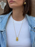 שרשרת עדינה, ארוכה, עשויה פליז מצופה זהב אשר ברכזה תליון מלבני בשיבו זירקונים לבנים ולב בורדו מנצנץ דמוי יהלום.