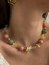 גולת הכותרת של הקולקצייה, השרשרת הכי אביבית והכי חגיגית שיש. שילוב של אבני חן מסוג ג'ייד בשלושה גוונים ובשני גדלים שונים, אבני קריסטל שקופות, חרוזי אקריל אובליים ואלמנטים מוזהבים, עבודת יד, עשויים פליז מצופה זהב.