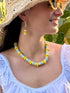 שרשרת מלאה בצבע וכיף. חרוזי קרמיקה עבודת יד עגולים בגוון תכלת, חרוזי קרמיקה בגוון ירוד ליים מטריף יחד עם דיסקיות אקריל בגוון שנהב. קיימים עגילים וצמיד תואמים