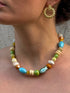 ה-שרשרת של הקולקצייה. שילוב של אבני חן, חרוזי קרמיקה עבודת יד, צדפים וחרוזי אקריל. שילוב של גווני שמים וירוק של צמיחה שעושים טוב בנשמה.